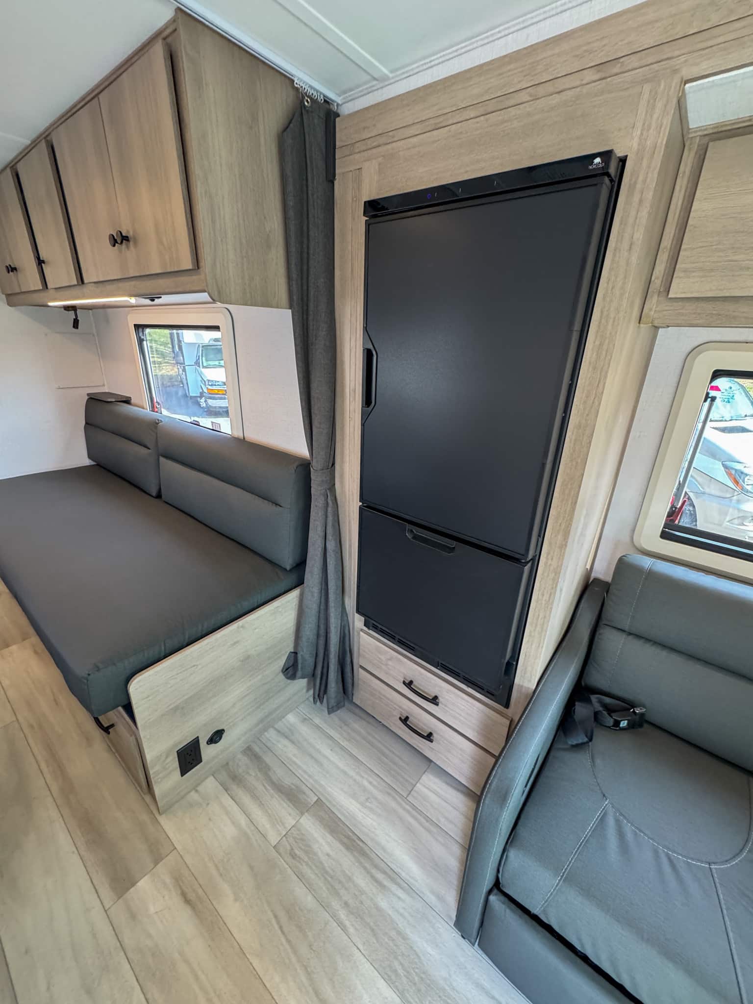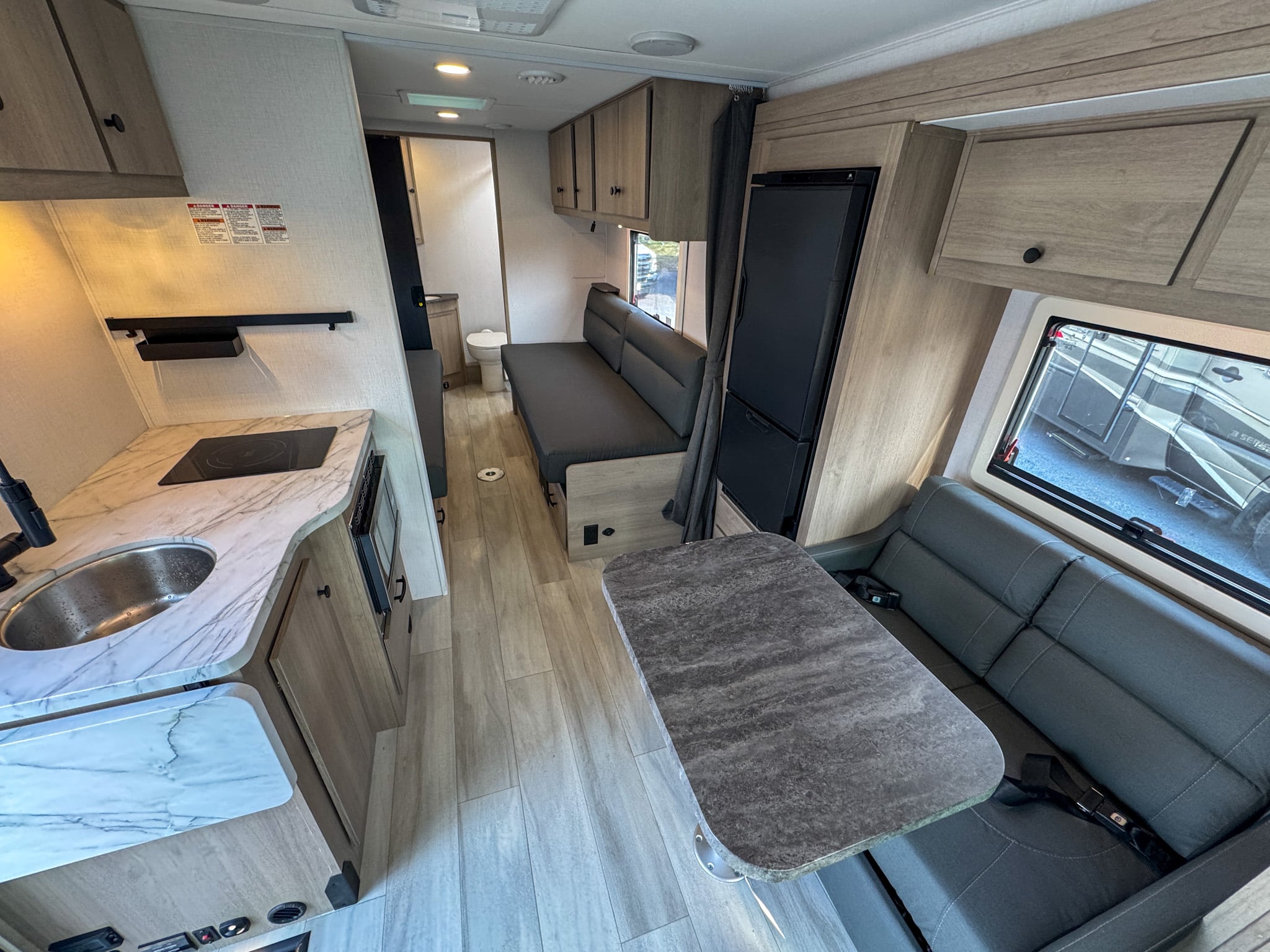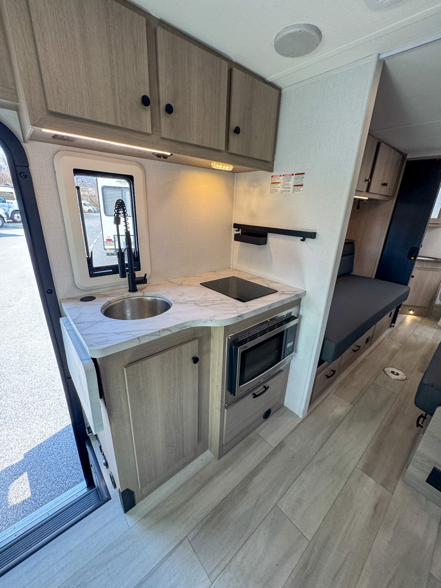The kitchen is designed with both functionality and convenience in mind, offering ample counter space, modern appliances, and generous storage. An induction cooktop, convection microwave, and refrigerator/freezer make meal preparation on the road easy, while overhead cabinetry and drawers keep everything organized and within reach. Whether preparing a quick breakfast or a full dinner, the kitchen supports comfortable extended travel.