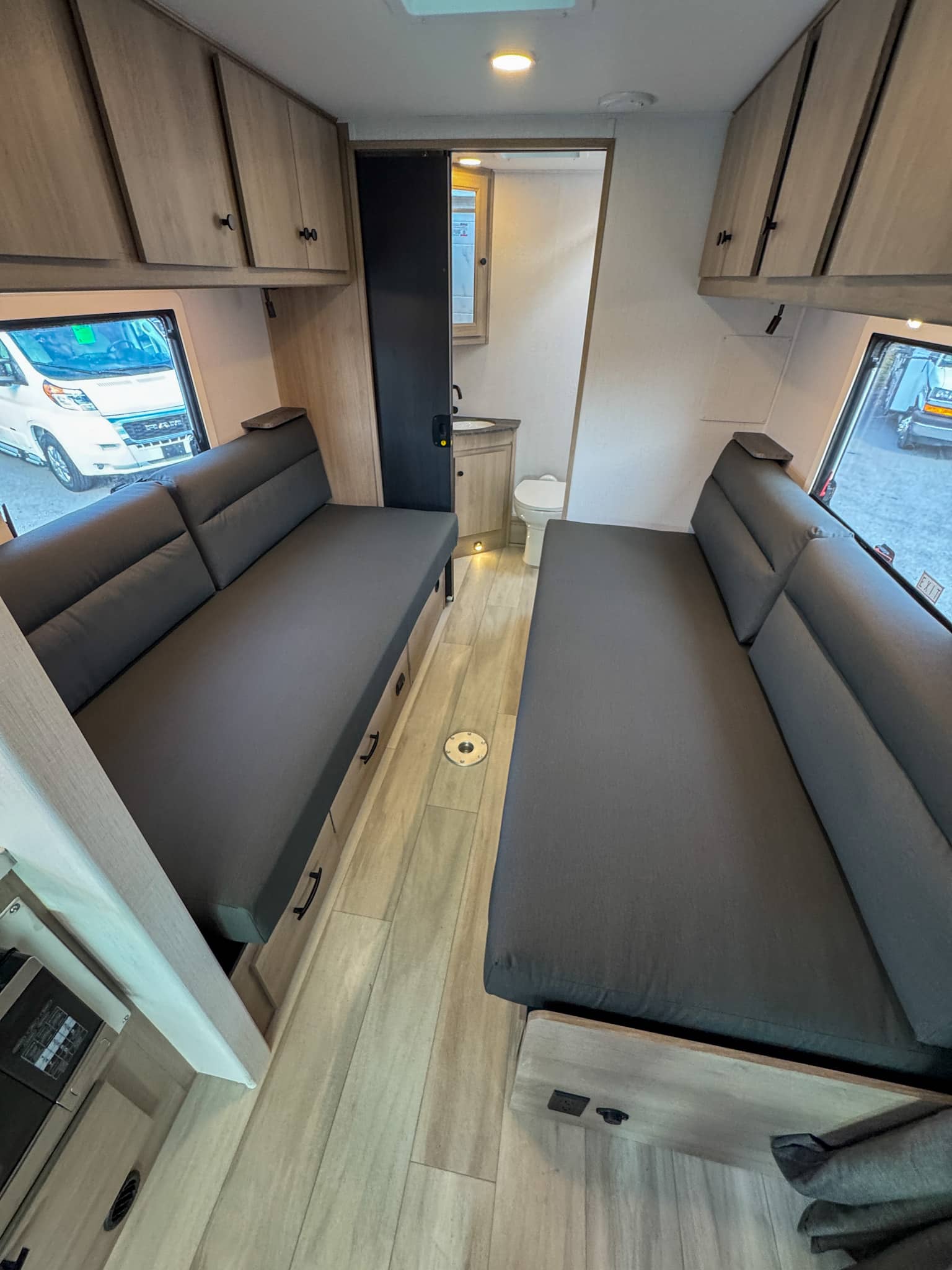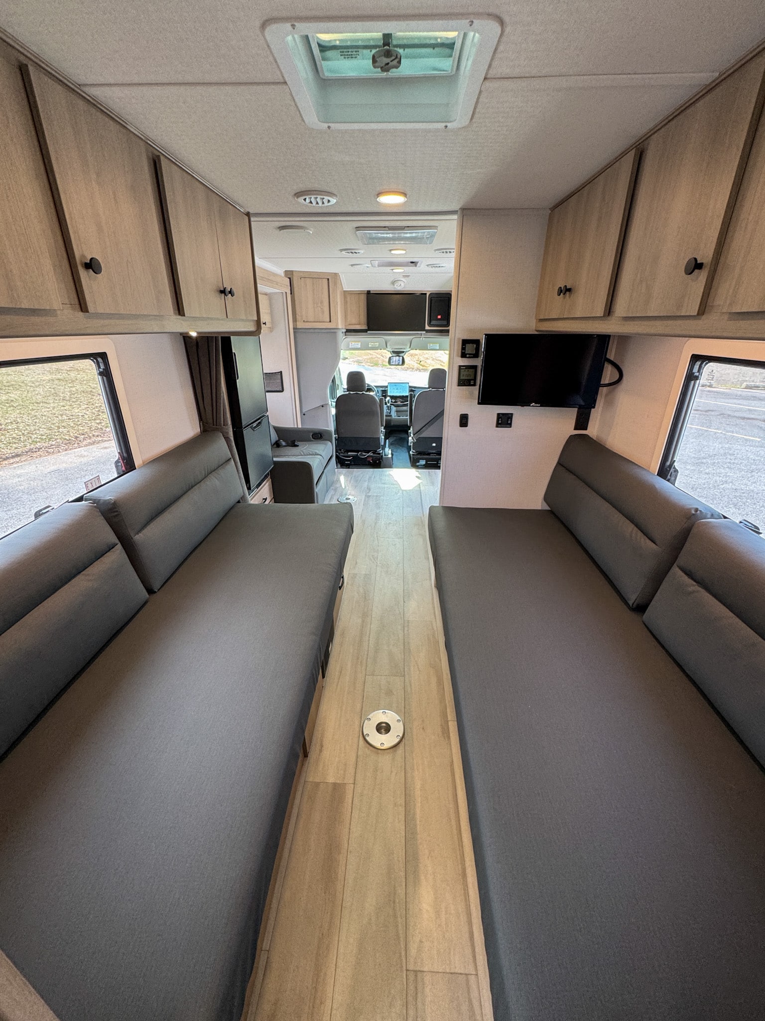 Inside, the Sunseeker 2370 features a smart twin-bed floorplan that offers exceptional flexibility. The rear twin beds provide comfortable, separate sleeping spaces and can easily convert into a large queen bed when desired, making the coach adaptable for different travel styles. A slide-out seating area expands the living space, creating a welcoming environment for relaxing, dining, or entertaining after a day of adventure. Large windows with day/night shades, modern décor, and LED lighting throughout give the interior an open, bright feel.