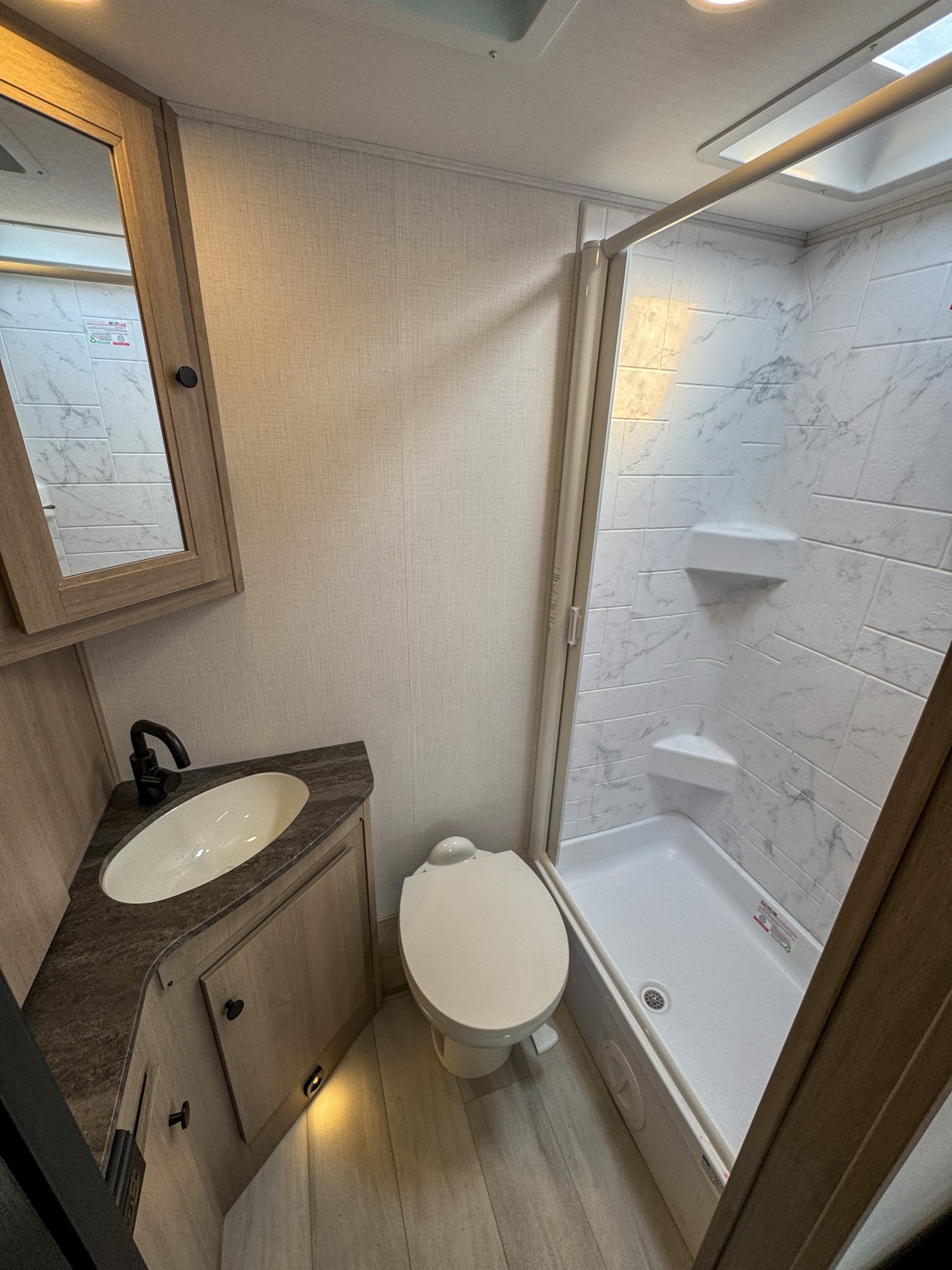 The bathroom is spacious for a motorhome of this size and includes a full shower with skylight, a toilet, sink, and huge storage for linens and personal items. Its layout ensures privacy and practicality, making longer trips more comfortable and eliminating the need to rely on campground facilities.