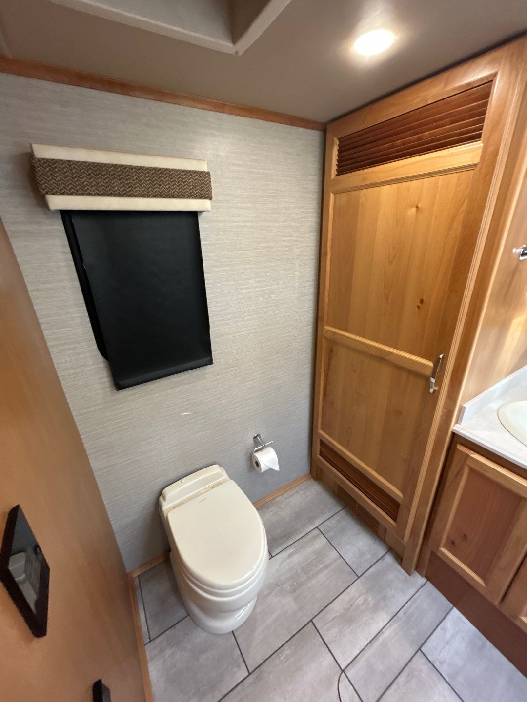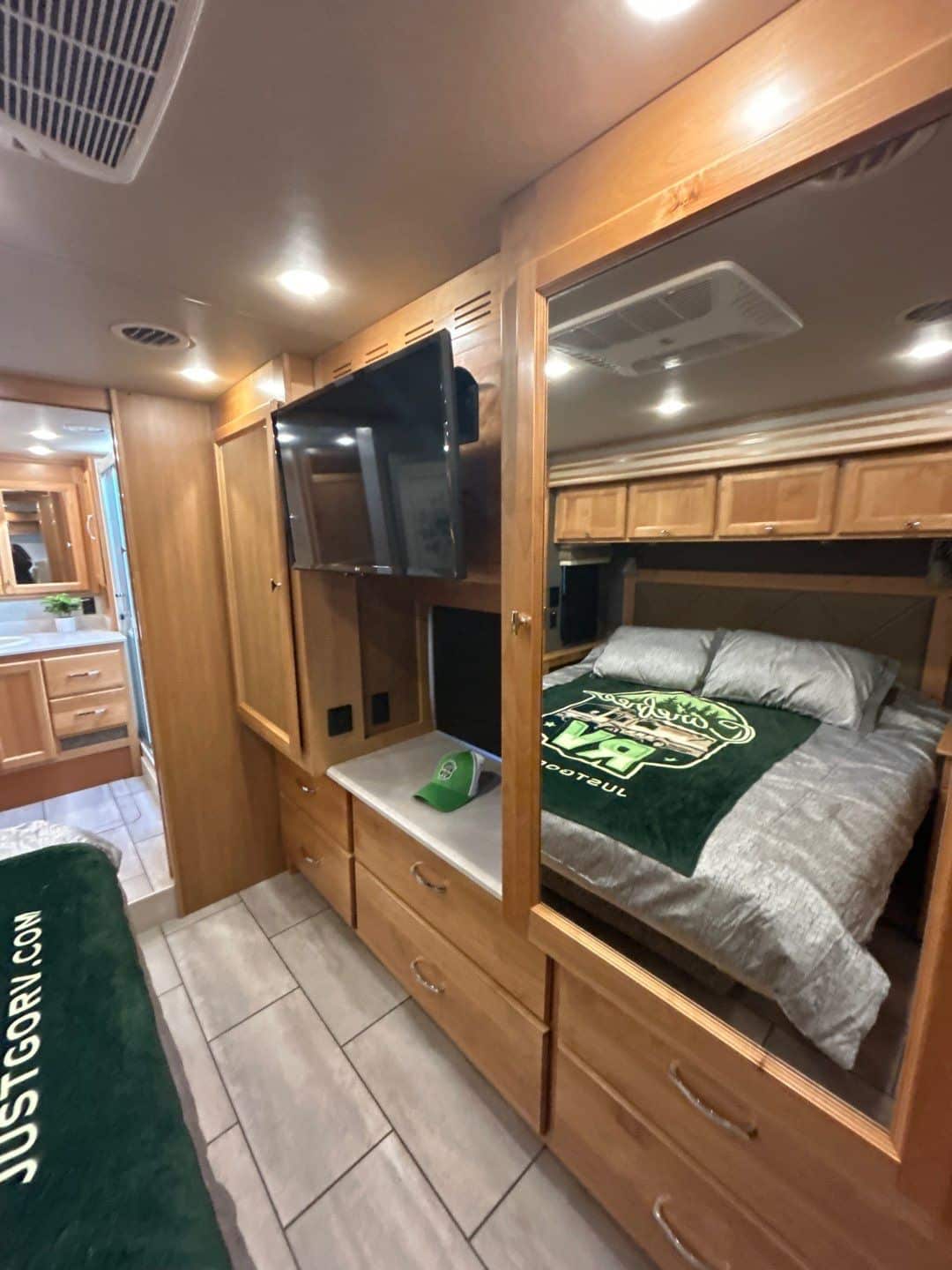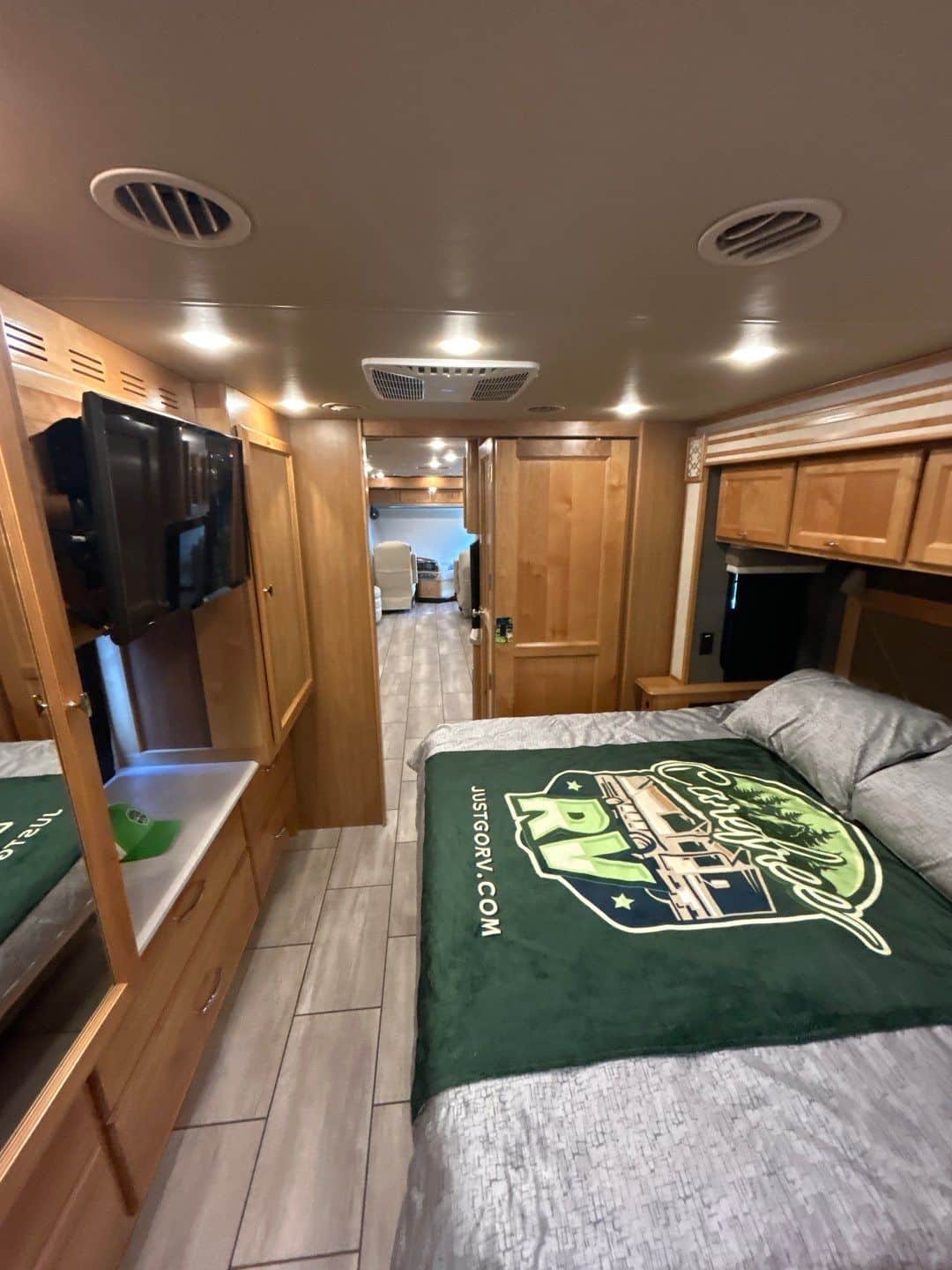 The exterior of the coach offers a power awning both over the patio area and another power awning over the entry door as well as a large Flat Screen HDTV. Additional basement storage is plentiful with pass though compartments and easy to use slide outs.