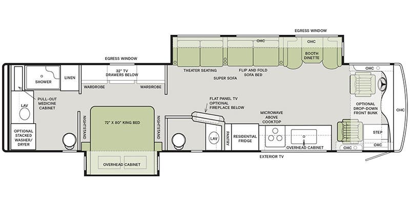 This unit will comfortably sleep 7 People. There is a Master Suite in the rear of the coach with a king bed, a SAT TV, dresser, full bath and closet that all can be closed off from the front half of the coach as well as a washer/dryer. In the front portion for sleeping, there is a pullout super sofa (queen), a convertible booth dinette, (full) and 1 overhead twin size dropdown bunk.